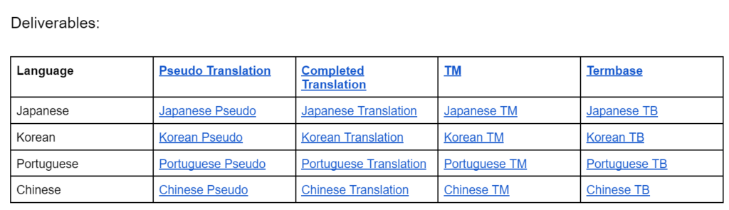 Leveraging our amazing teamwork, we successfully delivered all the required materials to our client on schedule. The deliverables consisted of thoroughly translated documents, Translation Memory, glossaries, and pseudo-translations for Chinese, Japanese, Korean, and Portuguese, ensuring a comprehensive and well-rounded translation package.
